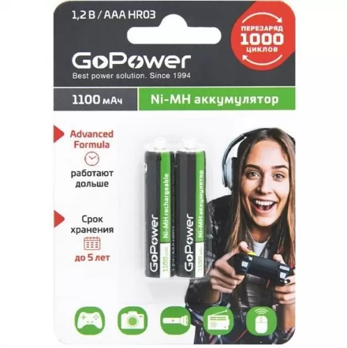 Аккумулятор размера ААА / R03 емкостью 1800мАч. Аккумуляторы GoPower перезаряжаемы до 1000 раз и заменят батарейки во всех современных устройствах, они сэкономят деньги и не навредят окружающей среде. Производятся по улучшенной технологии с использованием премиальных компонентов, что гарантирует продолжительный срок службы 1000 циклов и сниженный саморазряд.